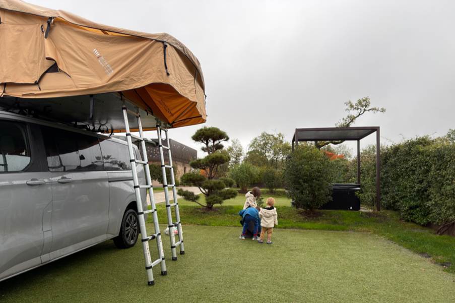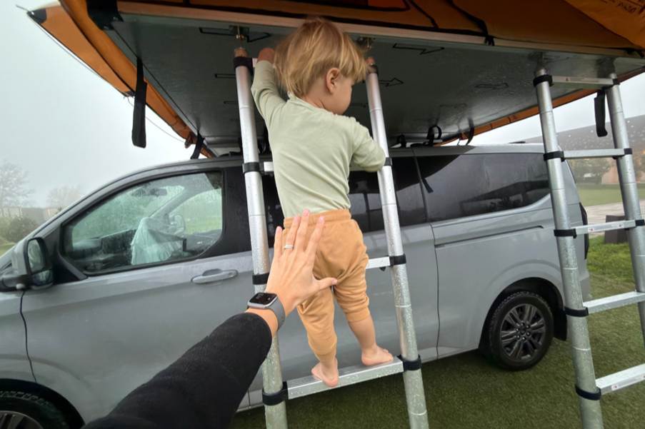 We hebben zowel wild gekampeerd als op campings, maar we hebben ons nooit bedreigd gevoeld. Bij wildkamperen is het belangrijk om ervoor te zorgen dat het deel van de tent dat uit de auto steekt ver genoeg van de weg verwijderd is en dat je niet de hele rustplaats in beslag neemt als je daar stopt. Je moet vermijden om op oneffen terrein en hellingen te parkeren, zodat je de tent gemakkelijker en veiliger kunt opzetten. Als er regen wordt voorspeld of als er al modder ligt, let dan op de grond rond de ladder, zodat deze niet te glad is, vooral als hij nat wordt. Wat betreft het opzetten van de tent zelf en de veiligheid tijdens die periode, hangt het af van waar we hem opzetten. Als we op een camping zijn of ver van een weg, water, enz., zijn de kinderen naast ons of spelen ze aan de zijkant. Als we in de buurt van een weg of een andere potentieel lastige situatie zijn, blijven ze die 10 minuten in de auto zitten en kijken ze door het raam naar ons. Tot nu toe is dit nooit een probleem voor hen geweest.